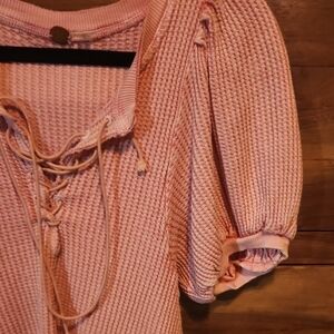 Free People Pink and White Puff Sleeve Blouse with Ruffled Tie Front