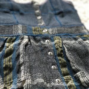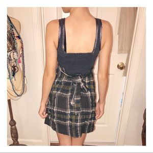 A gently used dress in good condition. The dress is a grey, blue, white and green/yellow plaid. It fits snug to the body in the top. There is a tie sewn into the waist of the dress to create more shape. The buttons down the front are all functional and original to the dress.