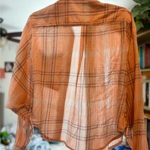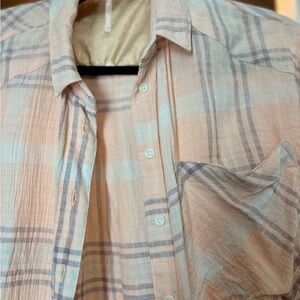 Free people casual plaid button-up shirt. Features a front pocket and relaxed fit. Bat wing sleeves. The main color is pinkish peach, very unique! Perfect for layering. Excellent condition, only worn once.