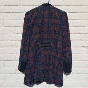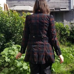 Lovely Victorian style peacoat with a zipper and puffed sleeves. Corduroy texture and black accent color on pocket flaps, collar, and sleeves. Some pilling on inside lining and missing last button on the front right side. There's also one mismatched button on the second to last spot on the right front. Preloved, but in good condition.