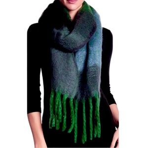 Free People Plaid Fringed Shawl Blue Green Oversized Wrap Fringe Scarf Fluffy