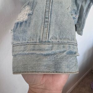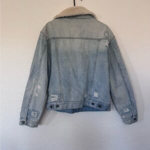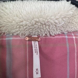 Free People Plaid Lined Sherpa Trucker Jacket size M. Preowned. Does have a tiny spot on the right shoulder( pictured) please see all of the pictures before purchasing. This will be the exact item you receive