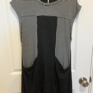 Free People Black White Polka Dot Striped Pattern Mini Dress With Front Pockets.