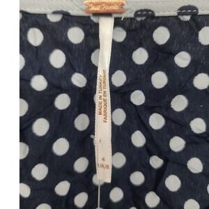 Free People puff-sleeve polka-dot crop top in light blue/navy. Same-size dots, scoop neck, on/off-shoulder styling. Cute with cropped jeans and white sneakers. Minor makeup mark at neckline and tiny shoulder snag—priced accordingly.