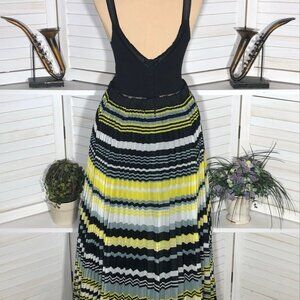 Elevate your boho-chic wardrobe with this stunning Free People vintage-style maxi dress. Featuring a flattering fit & flare silhouette, a richly embroidered navy blue bodice, and a bold pleated skirt with horizontal stripes in yellow, gray, white, and black. The perfect combination of structure and flow.