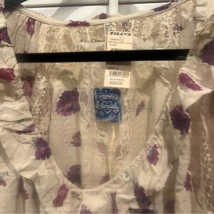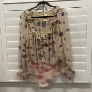 Free People Poppy Ruffle Bodysuit Size S Women's Ivory w/Purple Floral Blouse