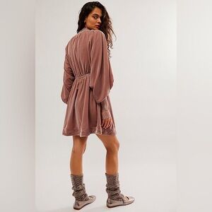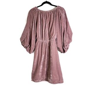 Beautiful dusty rose/ pink velvet dress. Surplus fabric so it will definitely fit up to a medium. Low v cut and elastic waist. Measurements in info photo.