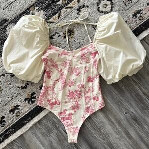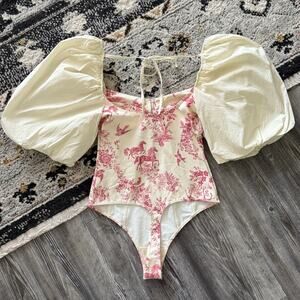 Features: Stretchy fabrication, corset-inspired seams, puffy short sleeves, low U-back, toile pattern, button gusset.