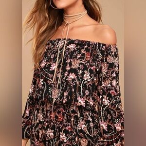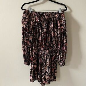 Free People Pretty and Free Black Floral Print Romper Size Small. Let your wild side loose in the Free People Pretty and Free Black Floral Print Romper! Soft woven rayon features a mauve, purple, and beige floral print, across an elasticized off-the-shoulder neckline and long sleeves with elastic cuffs. Breezy bodice, with back cutout, tops a stretchy smocked waist and fluttering shorts.