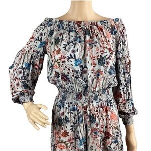 Effortlessly bohemian, the Free People Pretty and Free Romper is a must-have for any free-spirited wardrobe. Designed with an off-shoulder neckline, billowy 3/4 sleeves with elastic cuffs, and a flattering elastic waist, this romper blends comfort and style seamlessly. The partially open back adds a subtle, playful touch, while the soft floral print in muted gray tones enhances its vintage charm. Lightweight and breezy, this romper is perfect for festival season, summer days, or layered looks with boots and a denim jacket.