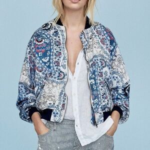Free People Printed Bomber Jacket Floral Navy Blue white and red