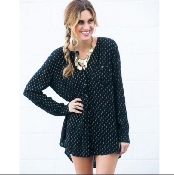 Free People Printed Deep V Boyfriend Shirt. Women's size small. Preowned in good condition . Oversized boyfriend printed buttondown with double button closures at neckline and a breast pocket. Hi-Lo hem. Styling Tip: This versatile top can also be worn as a super mini dress. For a no-show look layer with one of our seamless shorts for an effortless look.