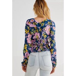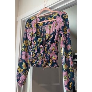 This stylish floral top features a vibrant mix of colors, perfect for any occasion. The smocked design offers a flattering fit, while the long sleeves add a touch of elegance. Ideal for pairing with your favorite jeans or skirt.