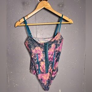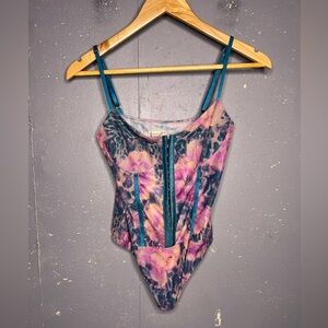 Pair this number with your favorite high-waisted jeans. Experience the elegance of Free People's Printed Night Rhythm Body Suit in the captivating Blue Lagoon floral print. This bodysuit features adjustable spaghetti straps, contrast seams, and a sweetheart neckline, enhancing its corset-inspired allure. Crafted from soft polyester mesh with seamed cups, it ensures a formfitting silhouette and a thong bottom for a seamless look. Closure: Hook-and-eye front closures. Care: Machine wash for easy maintenance.