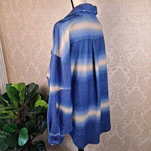 This slightly oversized shirt/jacket will keep you cozy. Collared neckline. Exterior pockets. Button cufs. Slight distressed finish. Shirt tail hem. Elbow patches.