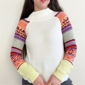 Cream colored ribbed pullover sweater with contrasting multi color knit sleeves. Mock neck. Lattice hem trim.
