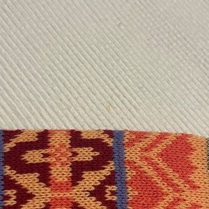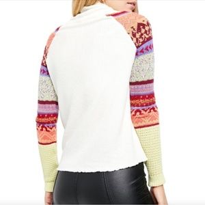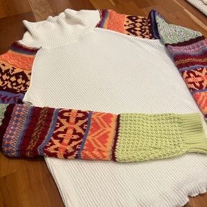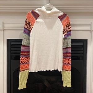 Colorful, patterned sleeves add eye-catching mixed-media style to this cool and cozy rib sweater.