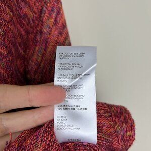 Free People Prism Space Dye Knit Linen Blend Pullover Sweater. Coral combo. Raw distressed hem. Boat neck. Long sleeves. Drop shoulders. Textured knit. Laid back, slouchy, oversized. Boho. Cotton, linen, viscose, nylon, acrylic blend. Retail: $128. Size Small. Armpit to armpit 29.5". Armpit to end of sleeve: 12.5". Length: 21.5". (333)