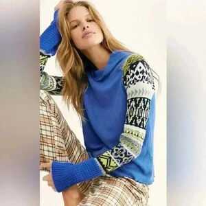 Free People Prism Sweater Blue Bell Combo Size S/P Intarsia-knit sleeves add a fun color-pop to this Free People classic ribbed turtleneck sweater.