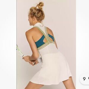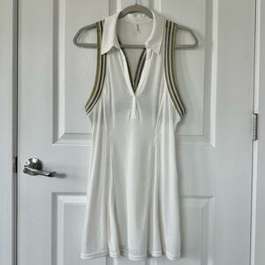 Cute collared tennis dress by Free People. White with green and blue accents. Ideal for active wear.