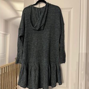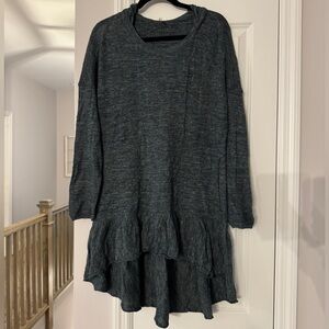 Get ready to cozy up in style with this brand-new, tags-on Free People Pullover Sweater Dress! This dark teal beauty is perfect for fall or winter, featuring a soft, textured knit fabric with a trendy high-low ruffle hem and a relaxed, oversized fit. It has a hood for extra warmth and long sleeves for those chilly days. Made from a blend of 45% acrylic, 20% wool, 20% linen, and 15% alpaca, this dress is as comfy as it is stylish.