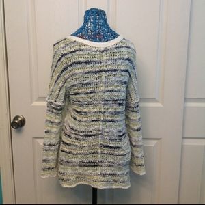 Oversized Free People sweater in a mix of marled and boucle stripes. Inside out seams. Long Raglan sleeves. Semi-sheer.