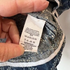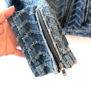 Features blue denim distressed fabric, asymmetrical zip-up closure, zippered front pockets and cuffs.