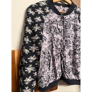 Free People Purple Black Floral Button Front Cropped Baseball Jacket Small