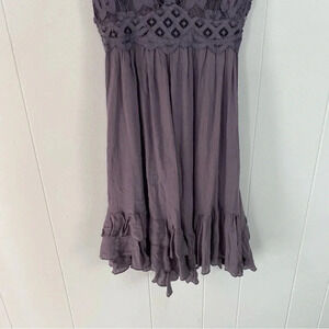 Elegant mini dress with lace detailing. Flowy skirt with ruffled hem. Perfect for casual outings or dress it up with the right shoe/accessories. Beautiful dress. Can be worn without a bra, or throw on a sticky bra for a little extra coverage.