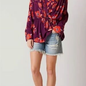 This elegant blouse from Free People features a sophisticated wrap style in a rich purple hue. The long sleeves and flowing design make it a versatile addition to any wardrobe, perfect for both casual and formal occasions. The wrap detail creates a flattering V-neckline, adding a touch of elegance to the overall look.
