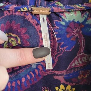 Stylish purple paisley crop top. Features a wrap design and long sleeves. Perfect for a chic look.