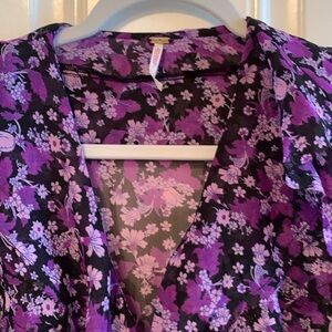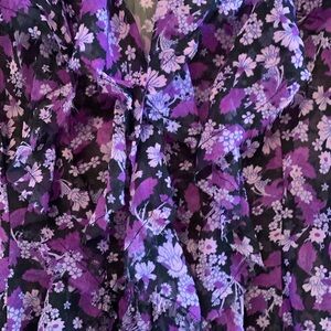Ruffle V Neck. Hook and eye closures. Raw hem on ruffle. Long loose sleeve. 27” long. Polyester. Hand wash.