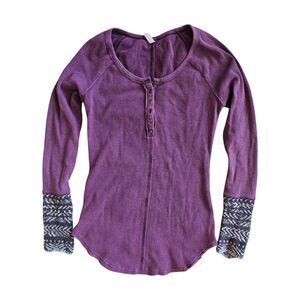 Free People Purple Ski Lodge Newbie Thermal Henley Top Crochet Cuffs Size L Boho