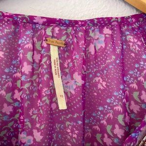 Bohemian style blouse with intricate embroidery. Features a mix of purple and pink patterns. Lightweight and flowy fabric. Perfect for casual wear.