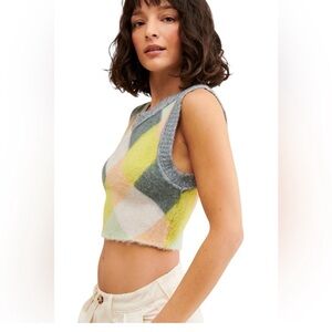 Free People Quinn Argyle V-Neck Cropped Sweater Vest Large NWT