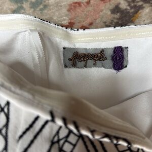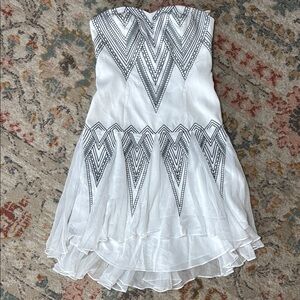 Elegant strapless drop waist flowy dress by Free People. Features a chic black embroidered pattern on a white base. Perfect for any occasion. The tag has been removed so please confirm measurements are appropriate for you.