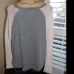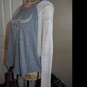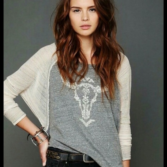 Free People We The Free Ragtime Heather Gray and Pastel Raglan. Cotton knit. Steer Embroidered front, crochet sheer net Raglan long sleeves. Relaxed fit. Size small.
