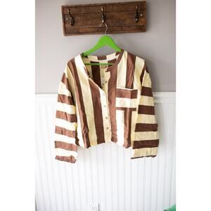Features: Front button-up closures, colorblock striped fabrication, exaggerated sleeves, dropped shoulder seams