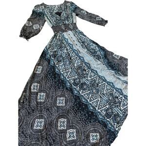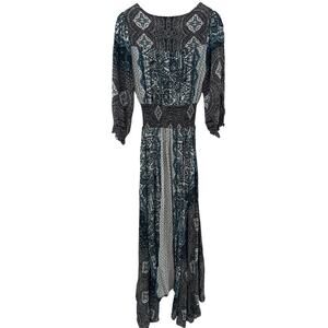 Travel through the desert in style in the Free People Mexicali Rose Black Print Maxi Dress! Lightweight woven rayon, in a lovely black, blue, and white Boho print, shapes a V-neckline, and three-quarter sleeves, with smocked, ruffled cuffs. Button up bodice continues into a smocked waist and full maxi skirt with front slit.