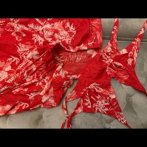 Free people maxi dress with a floral Hawaiian pattern in white and raspberry. Has a total of 6 slits to allow for a graceful flowy look when walking. The “skirt” part has an adjustable tie waist to adjust to your waist size. This easily allows for a size small girl to wear as well. There are also two back tie waist and a neck tie as pictured. Feel free to ask questions or make an offer!