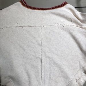 Very soft and comfortable free people sweater top in awesome condition (worn once and washed once). It features an open neck, with red and orange neck and cuff detailing, and has a raw hem. The tag reads XS, but it can fit XS, S, and M because of its loose fit. This beautiful top looks great with jeans or over skirts. It is pictured here with Frye combat boots, also available in my closet! All pictures are mine. Feel free to comment with any questions :)