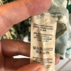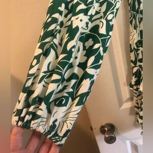 Free People Rebecca Ruffle Mini Dress in size Small. With a beautiful floral pattern, V-neckline, and long sleeves, this dress is perfect for any occasion. Made of lightweight and airy rayon fabric, it's machine washable for easy care and maintenance. The dress features colorful and bohemian accents with a touch of ruffles and comes in a stunning green and white color. This dress is perfect for year round wear.