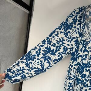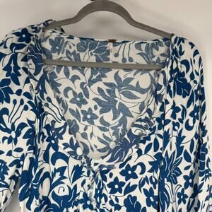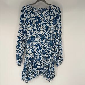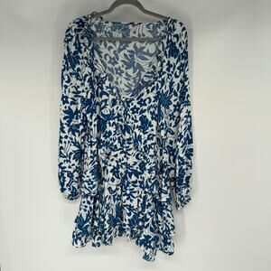 Free People Rebecca Ruffle Mini Dress Sz S Blue White Floral V-Neck Long Sleeves