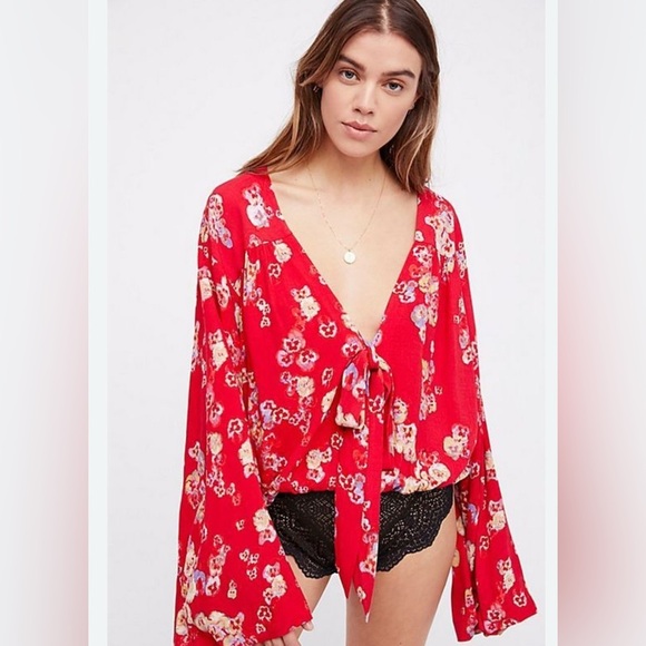 Vibrant red bodysuit with floral pattern. Features long sleeves and deep V-neck. Stylish and comfortable.
