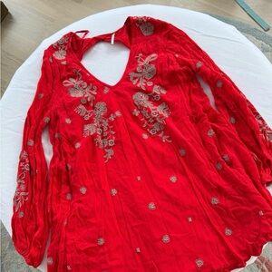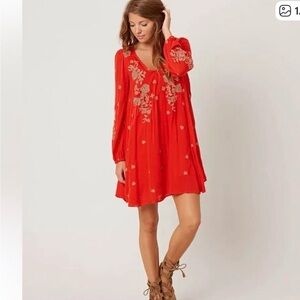 Free People Long Balloon Sleeve Swing Mini Dress. Sweet Tennessee Red Embroidered Boho. Size Small.