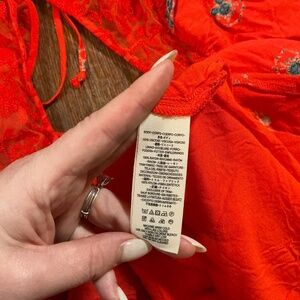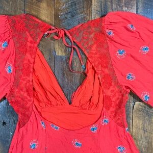 Free People Red Floral Mini Dress Puff Sleeve Open Back Size 10
