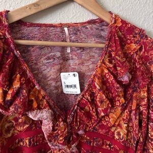 Free People Red Floral Rudi Boho Peasant Ruffle Blouse Size S NWT Cropped Cardi