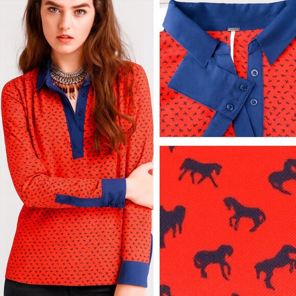 Free People Red Horse Print Boyfriend Blouse Navy Trim Thanksgiving Top Flowy