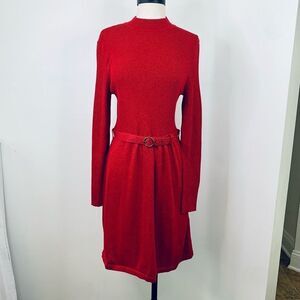 Free People Red Sparkly Knit long sleeve belted mini sweater dress.