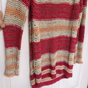 Long knit sweater, showcasing a striking red and cream striped pattern. The crew neck design and open-weave texture offer a casual yet chic look, perfect for layering. Its long sleeves and varied stripe widths add a touch of visual intrigue to your everyday wardrobe.
